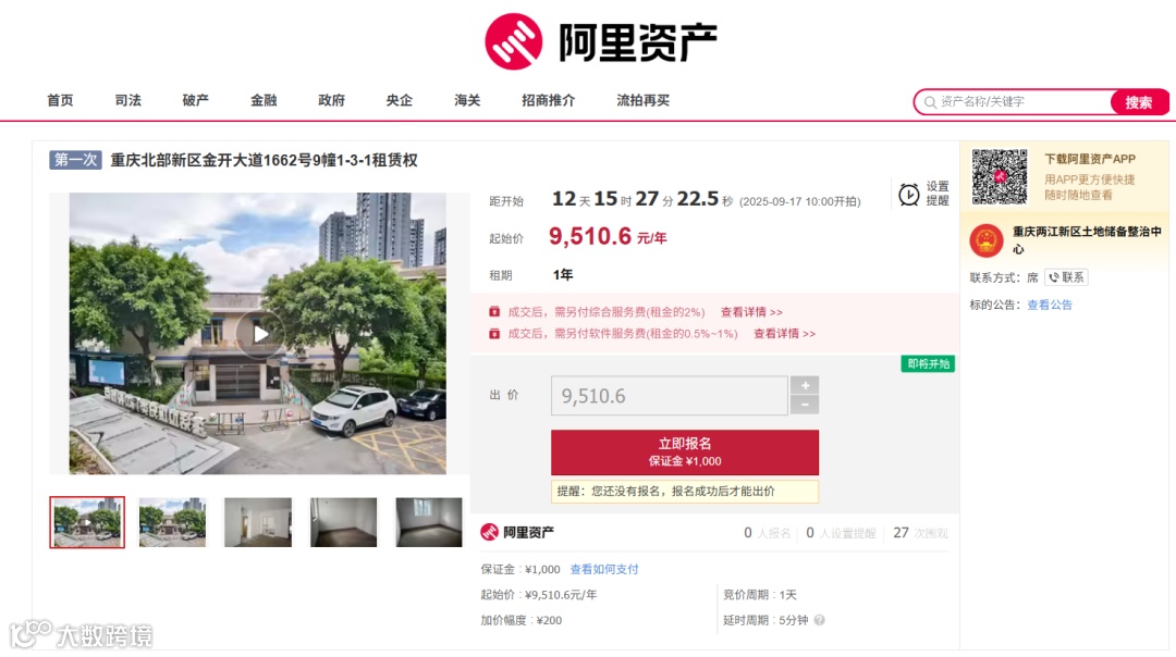该标的起拍价为9510.6元/年,参拍需缴纳保证金为1000元,每次增价幅度为200元以及其整倍数。