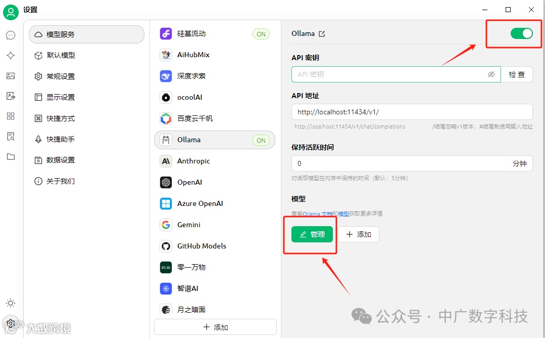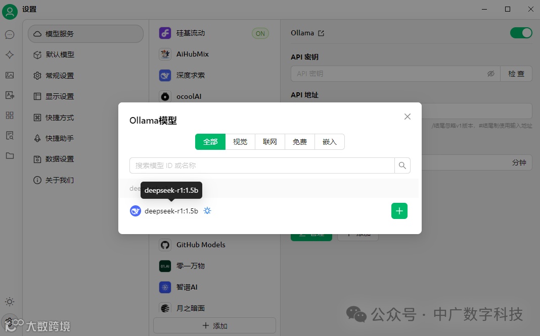下载客户端,进行安装,安装完成后,点击左下角“设置”,“模型服务”选择“Ollama”。