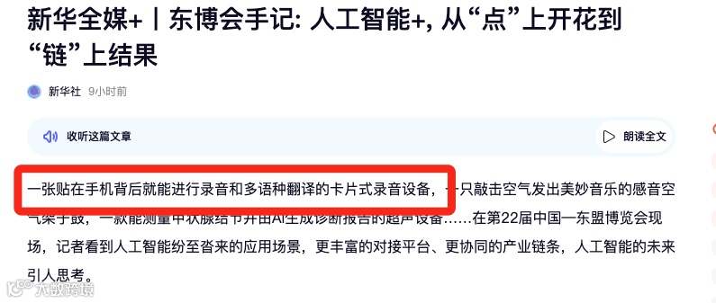 在第22届中国—东盟博览会上,人工智能应用成为焦点。新华社记者在现场报道中特别提到——“一张贴在手机背后就能进行录音和多语种翻译的卡片式录音设备”,这正是中广数科集团推出的AI磁吸翻译器。