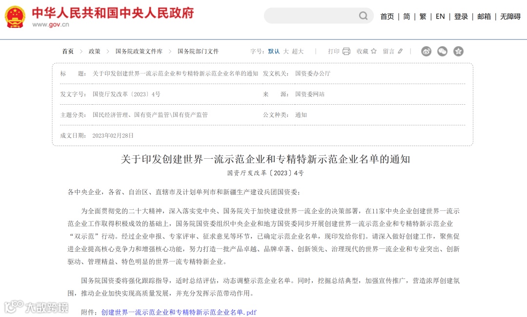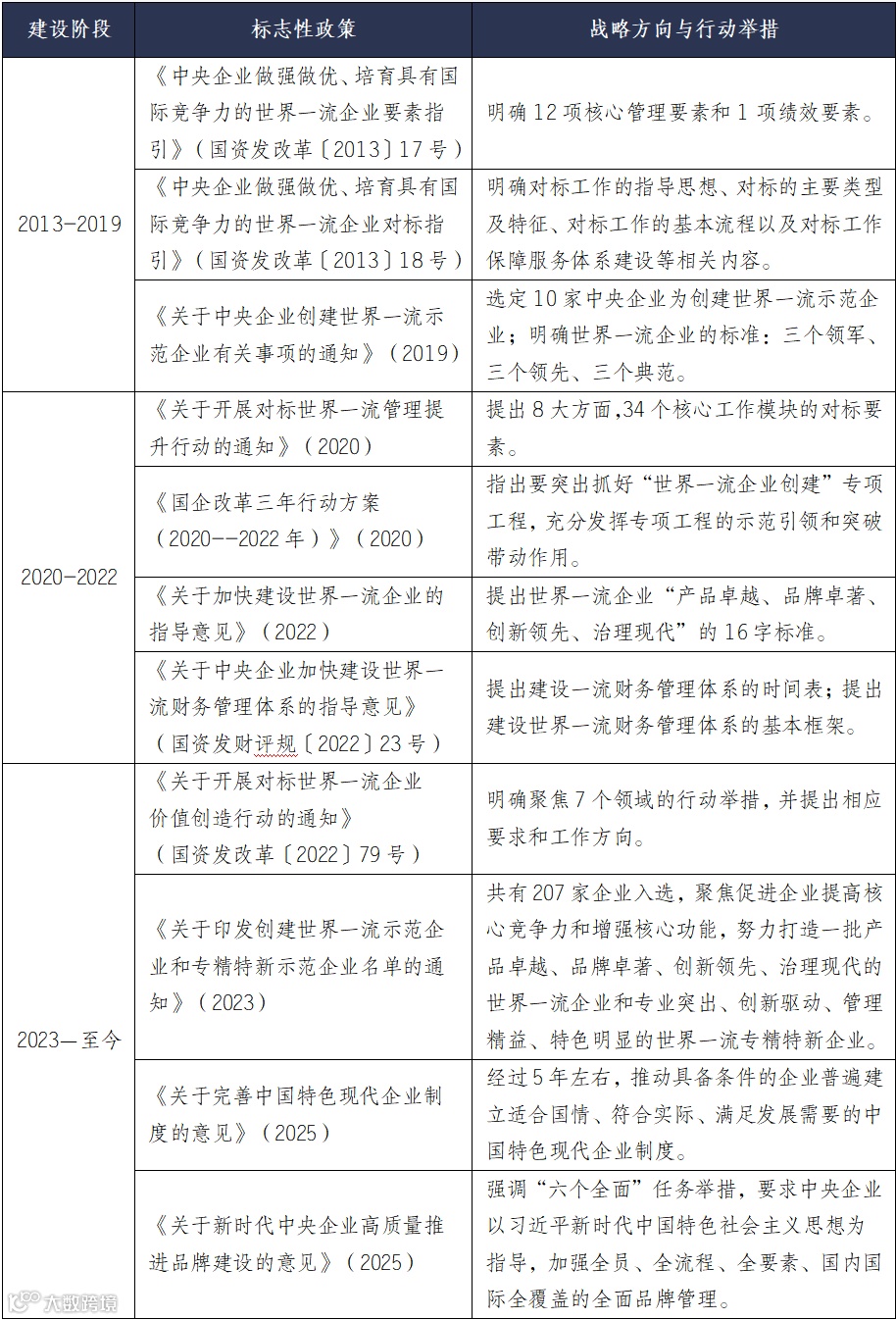 ▶ 试点探索:2018年国资委选取11家中央企业开展创建世界一流示范企业试点,首次提出“三个领军、三个领先、三个典范”标准(领军行业发展、领先技术水平、典范社会责任)。2019年初,国务院国资委进一步扩大试点范围,将航天科技、中国石油等10家央企纳入示范名单,推动企业制定明确的时间表和路线图。