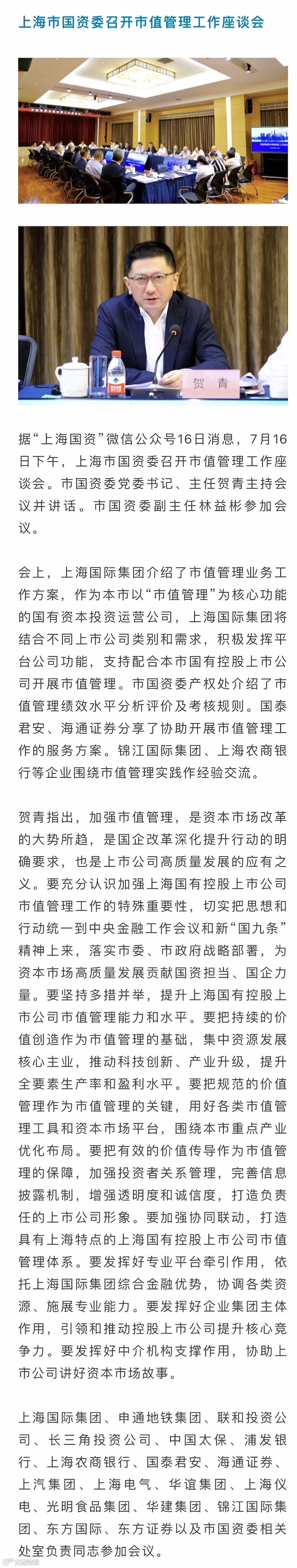 7月16日下午,市国资委召开市值管理工作座谈会。市国资委党委书记、主任贺青主持会议并讲话。市国资委副主任林益彬参加会议。