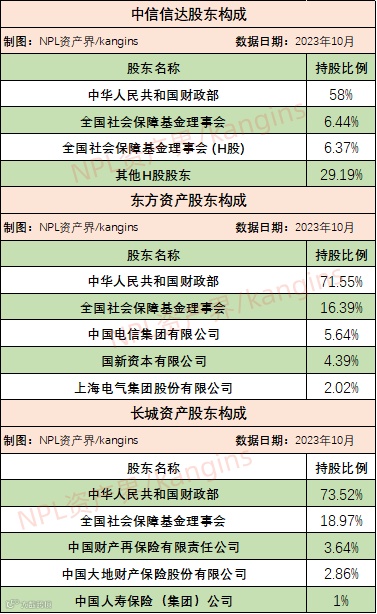 当前,中国信达、东方资产、长城资产的第一大股东和第二股东均是财政部及全国社会保障基金理事会,持股比例最高的是长城资产,两者合并持股超过90%,其次是东方资产,两者合并持股89%,中国信达资产最低,仅为64%。