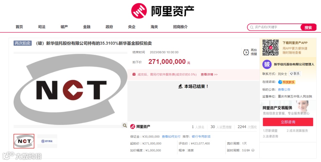 早在今年8月底,新华信托持有的价值2.71亿元的新华基金股权已经顺利拍卖成交。