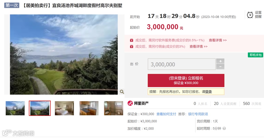 本次拍卖的这一套别墅,建筑面积425.04㎡,总共两层,精装修,起拍价300万元,保证金30万元,加价幅度仅2000元,将于10月8日开拍。