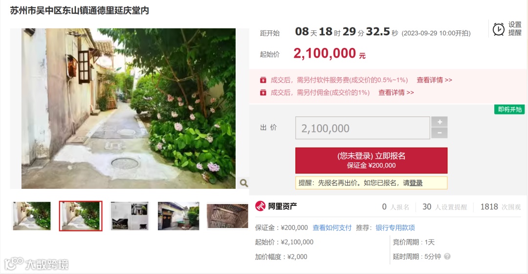本次上架的苏州市吴中区东山镇通德里延庆堂内标的物关注度也颇高,目前已有30人设置提醒,近2000人次围观。房子建筑面积146㎡,土地面积185.7㎡,将于9月29日开拍。起拍价210万元,保证金20万元,加价幅度2000元或其整数倍。