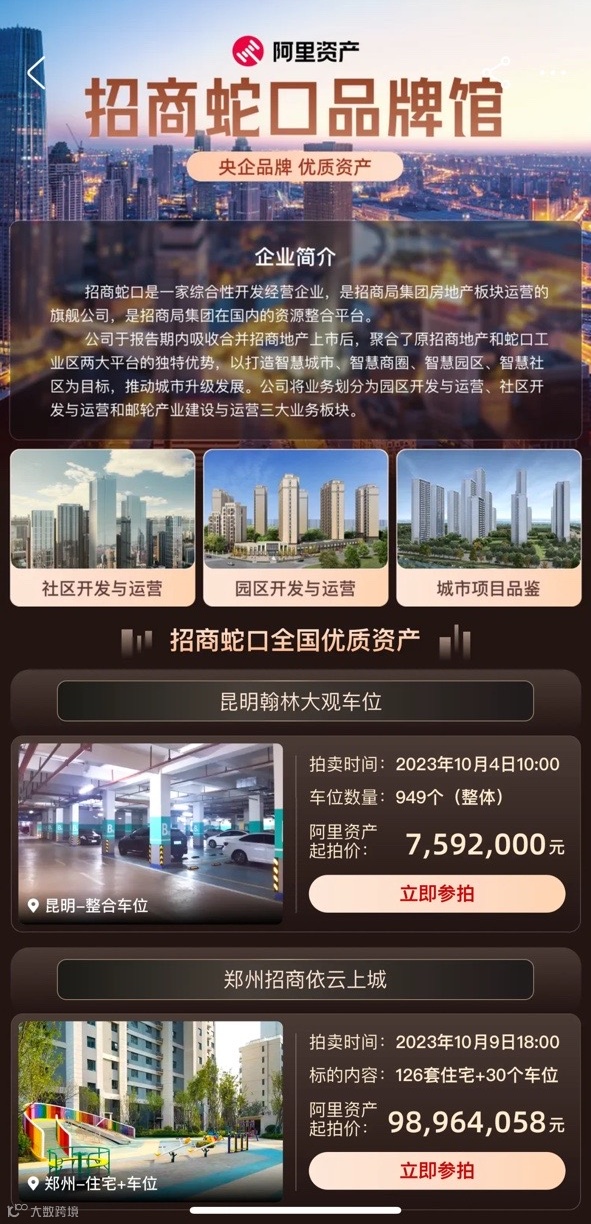 本次招商蛇口和阿里资产建立新一轮的集团战略合作,更是深化了双方在大宗交易领域的合作,也旨在充分发挥阿里流量、技术、服务等平台优势,助力房地产市场高效去库存。近期,双方着重推进全国存量国有资产数字化处置,在全国范围内组织宣贯,招商蛇口各地方公司积极报名金九银十房产大促,当前已完成上架多个标的项目,涉及数十套优质商业资产,起拍价从72万到1.45亿元不等,能够满足不同群体置业者需求。阿里资产方面也表示,未来还将进一步为房地产开发商、拍卖行、国央企、政府及中小发展企业等提供高效盘活资产的能力,为存量市场去库存、为资产重获新生持续创造更大价值。