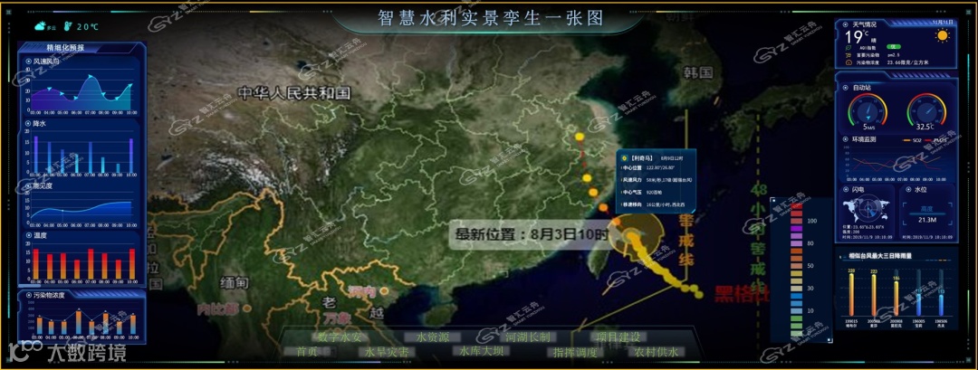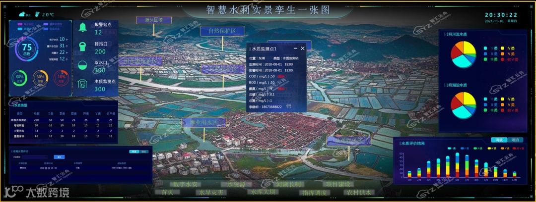 在实景三维一张图场景中,对水源地分布进行直观展示,水库、水源井、泵站等关键位置直观标注,可以联动场景快速定位至水源地区域浏览周边环境和监测数据详情信息。对前端全量监测数据进行综合汇聚分析,并以可视化图表方式在综合态势一张图直观展示,为管理人员的精准管理和科学决策提供可视化数据支撑。