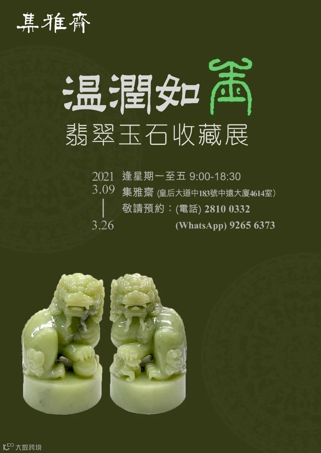 集雅斋特别举办「温润如玉」翡翠玉石收藏展,展出各类极具收藏价值的精品,包括缅甸玉、绿玉(纽西兰玉)、翡翠、软玉及原石等,带您从艺术、生活、美学等多角度认识各种翡翠玉石。