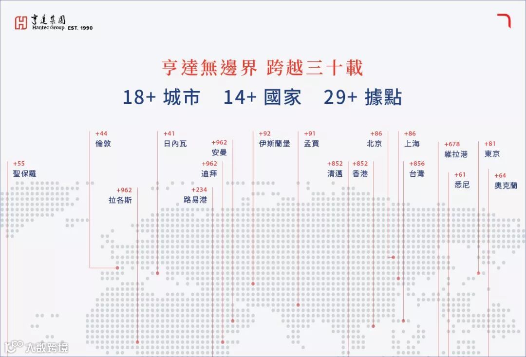 亨达集团的四大业务的服务范围已经复盖,全球18个城市,14个国家,为大家提供全面的综合企业服务,共同创造丰盛人生 。