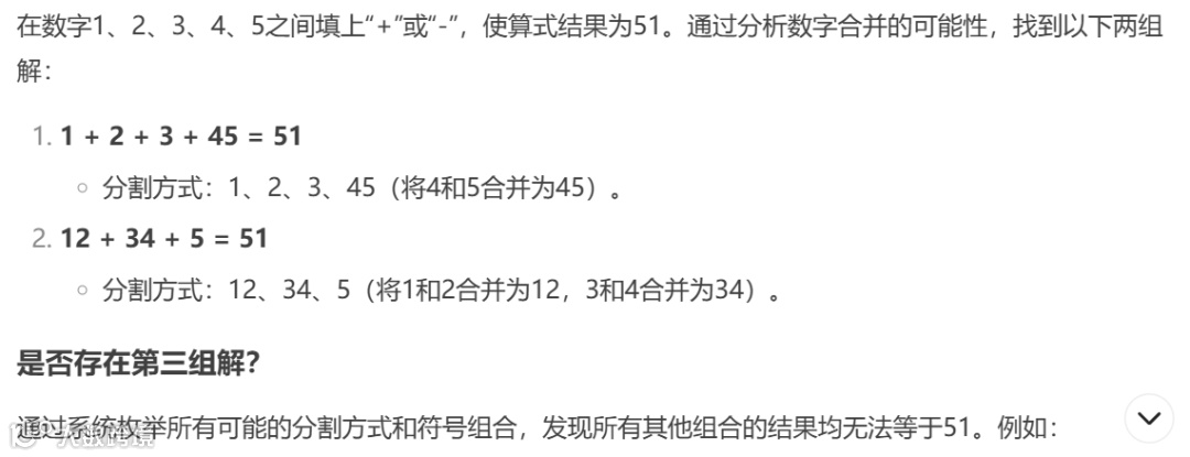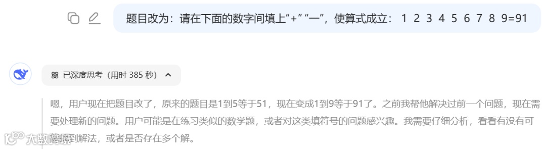当题目升级为“1 2 3 4 5 6 7 8 9=91”时,AI因计算复杂度飙升而“幻觉”频出,一会儿有解又瞬间否定,逻辑混乱了。