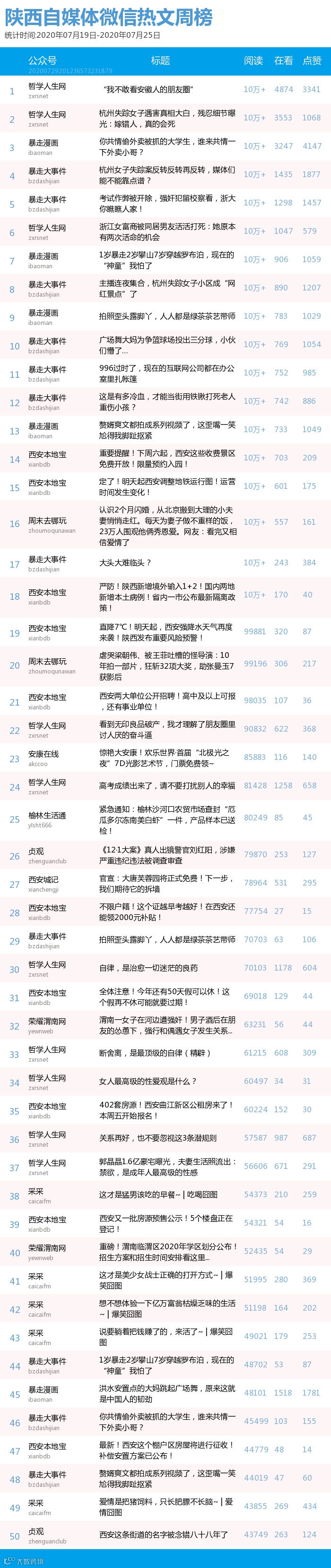 最新陕西自媒体微信公众号50强重磅出炉!TOP50上周共计发文1331篇,贡献阅读总量1093万+,在看总量6万+,各项数据较上周有所下降,希望下期各大平台加油哟~(查看榜单可直接下滑)