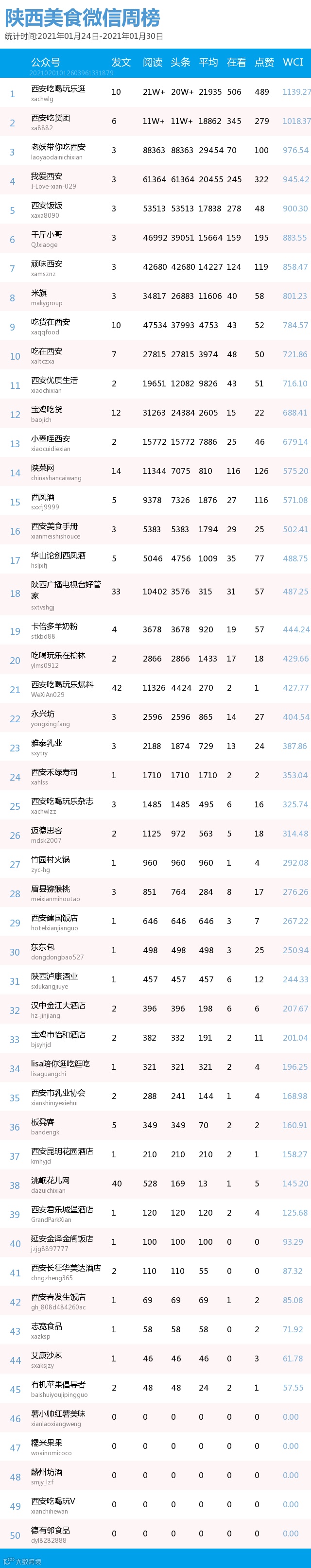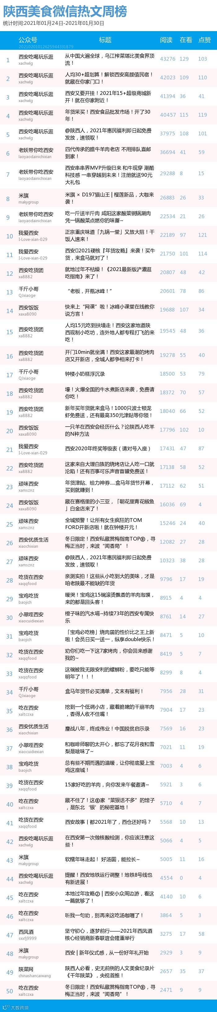 最新陕西美食类微信公众号50强重磅出炉!TOP50上周共计发文256篇,阅读总量达到86万+,在看总量达到2299。阅读总量较上周有所下降,希望下期各大平台再接再厉!(查看榜单可直接下滑)