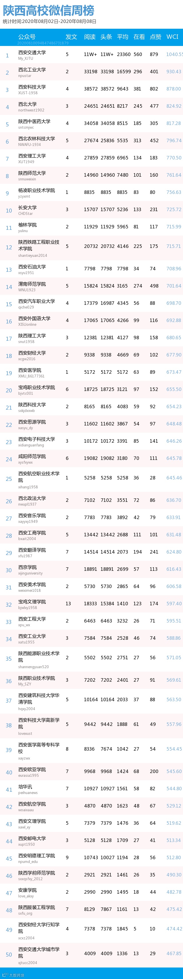 最新陕西高校微信公众号50强重磅出炉!TOP50上周共计发199篇,贡献阅读总量74万+,在看总量5085,数据较上周有所下降,希望各大平台下期继续加油哦~(查看榜单可直接下滑)