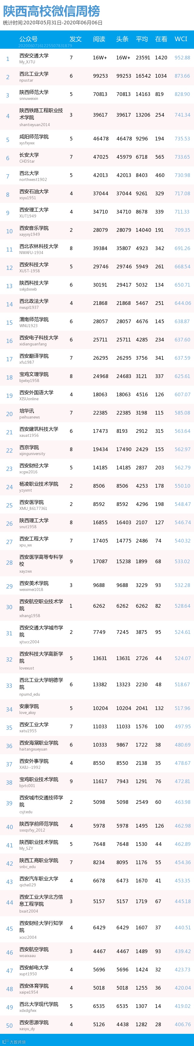 最新陕西高校微信公众号50强重磅出炉!TOP50上周共计发253篇,贡献阅读总量116万+,在看总量10585,数据较上周有所下降,希望各大平台下期继续加油哦~(查看榜单可直接下滑)