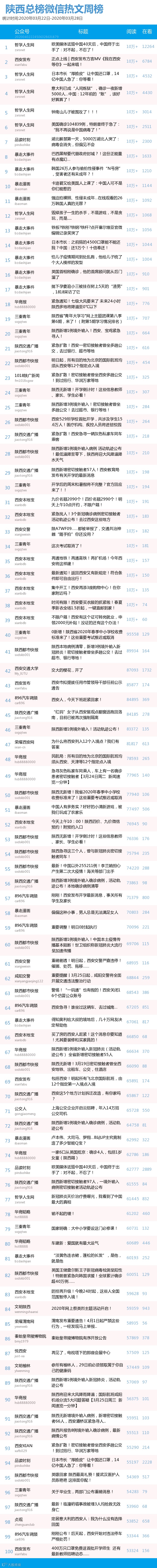 最新陕西微信公众号总榜周榜100强重磅出炉!TOP100上周共计发文3248篇,阅读总量达3021万+,在看总量20万+。各项数据相比上期有所下降,希望下期各大平台再接再厉!(查看榜单可直接下滑)