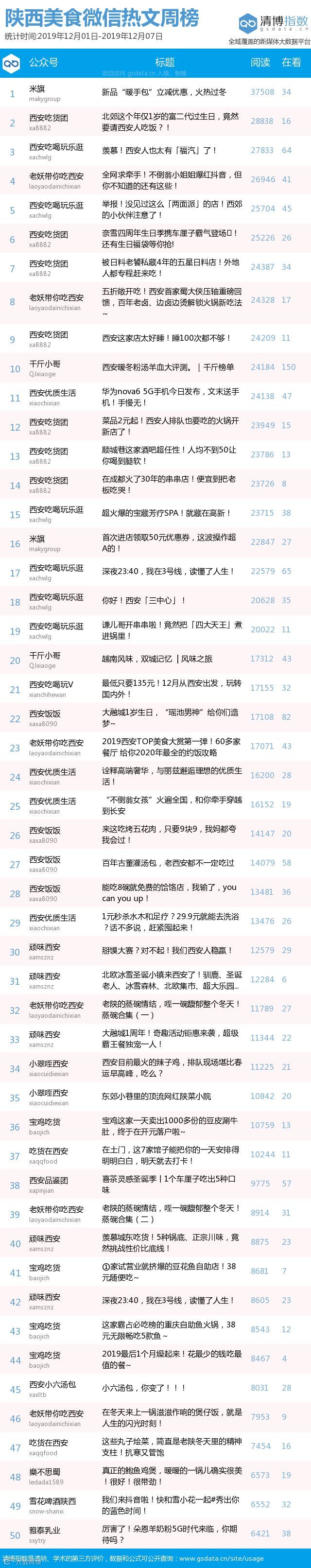 最新陕西美食类微信公众号50强重磅出炉!TOP50上周共计发文295篇,阅读总量达到99万+,在看总量达到2393。阅读总量较上周有所下降。希望各大平台下期再接再厉~(查看榜单可直接下滑)