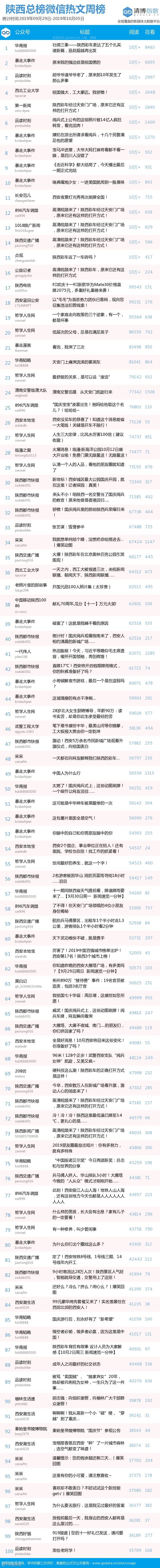 最新陕西微信公众号总榜周榜100强重磅出炉!TOP100上周共计发文2223篇,阅读总量达1755万+,在看总量13万+。阅读总量相比上周有所下降,但在看总数有所增加,希望下期各大平台继续加油!(查看榜单可直接下滑)