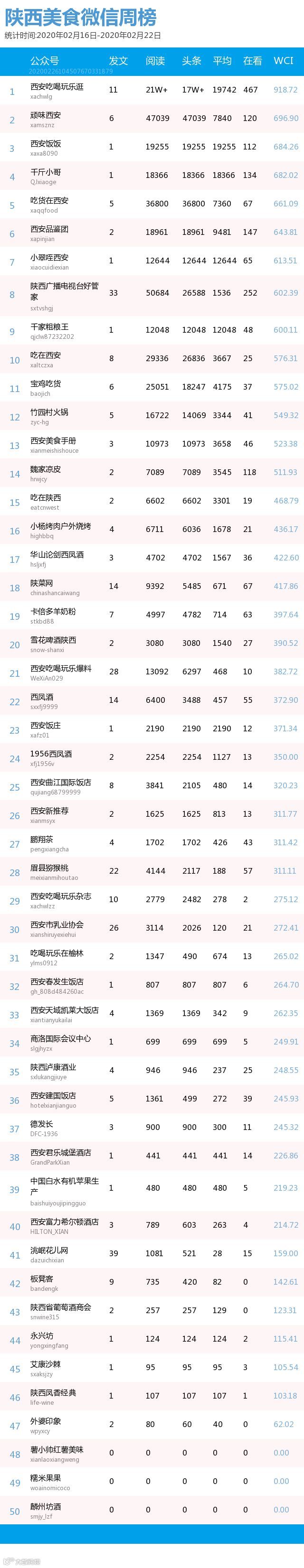 最新陕西美食类微信公众号50强重磅出炉!TOP50上周共计发文314篇,阅读总量达到60万+,在看总量达到2304。阅读总量较上周有所下降。希望各大平台下期再接再厉~(查看榜单可直接下滑)