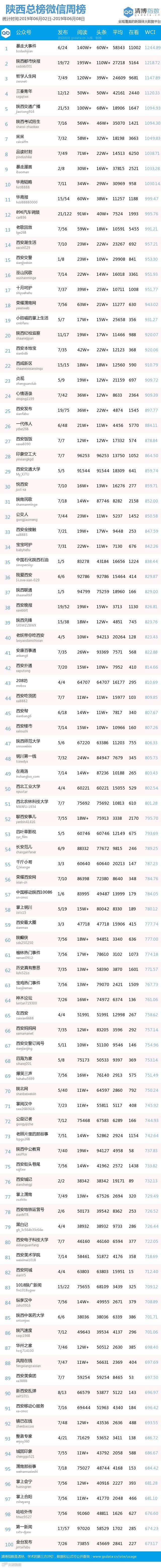 最新陕西微信公众号总榜周榜100强重磅出炉!TOP100上周共计发文2725篇,阅读总量达2269万+,在看总量11万+。相比上期各项数据均有所上升。