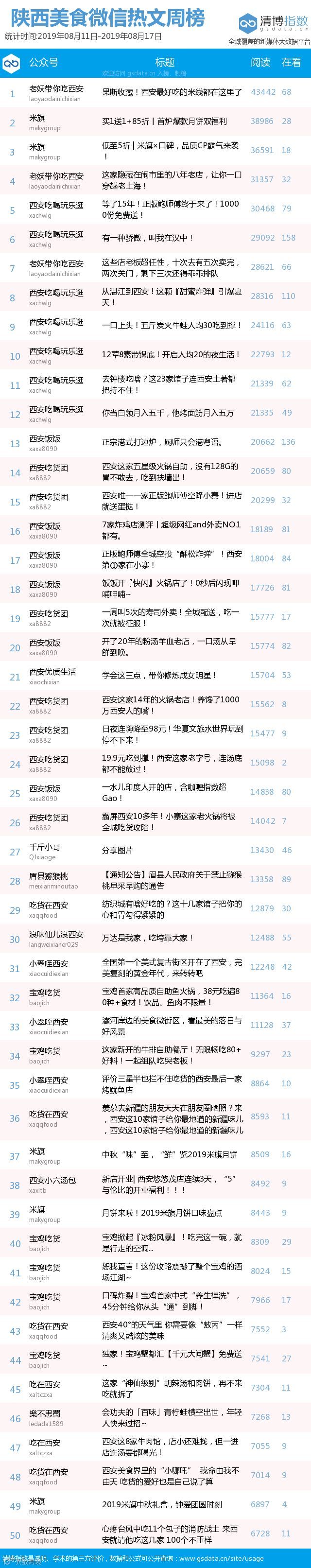 最新陕西美食类微信公众号50强重磅出炉!TOP50上周共计发文326篇,阅读总量达到93万+,在看总量达到2732。数据较上周均有所上升。期待各大平台下期有更好的表现!(查看榜单可直接下滑)