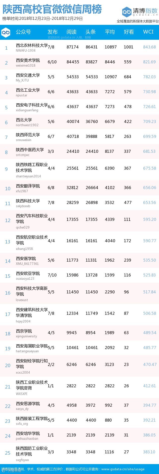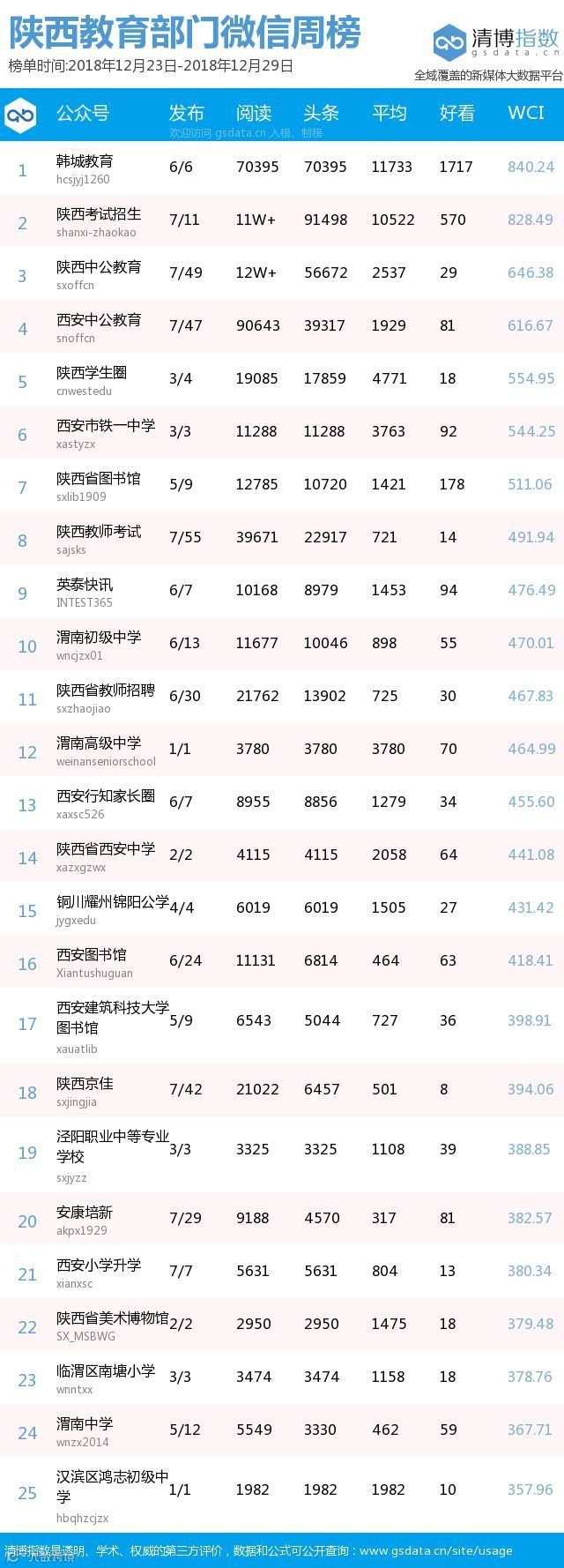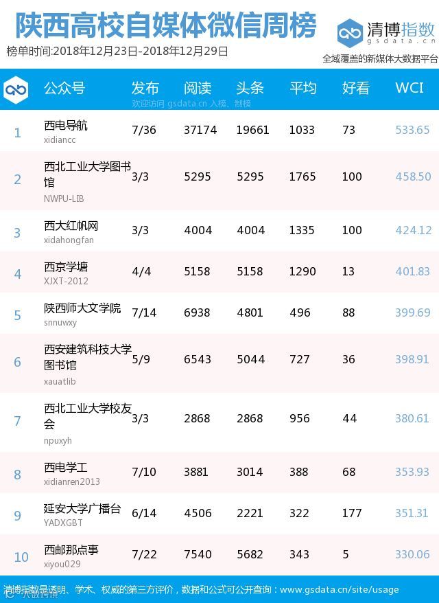 ● 本期陕西教育类新媒体周榜包含以下四个榜单:依次为陕西省教育部门官方微信周榜TOP25、陕西高校官方微信周榜TOP25、陕西高校自媒体周榜TOP10、陕西教育培训机构微信周榜TOP10。更多行业新媒体榜单可登陆清博指数官网查询:www.gsdata.cn.