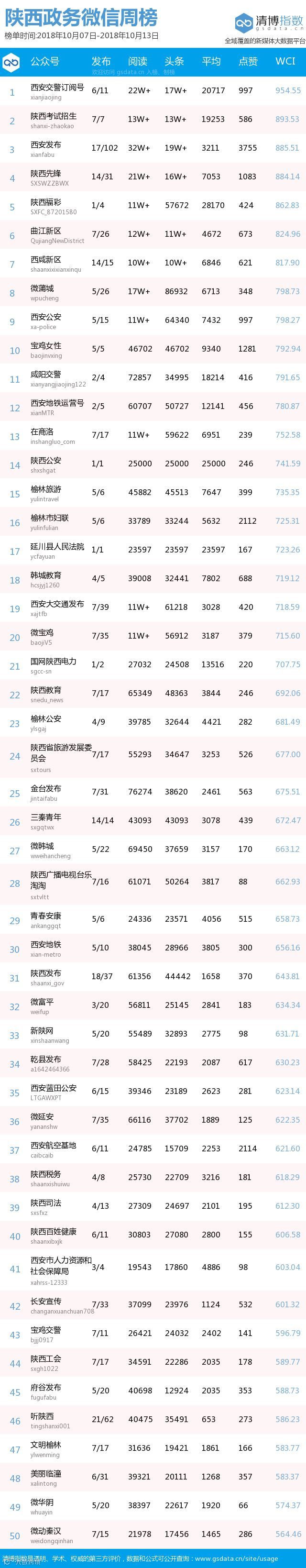 最新陕西政务微信公众号50强重磅出炉!TOP50上周共计发文933篇,阅读总量达344万+,点赞总量26405,本周数据相较上周有所回升,希望下期各大平台能继续加油!