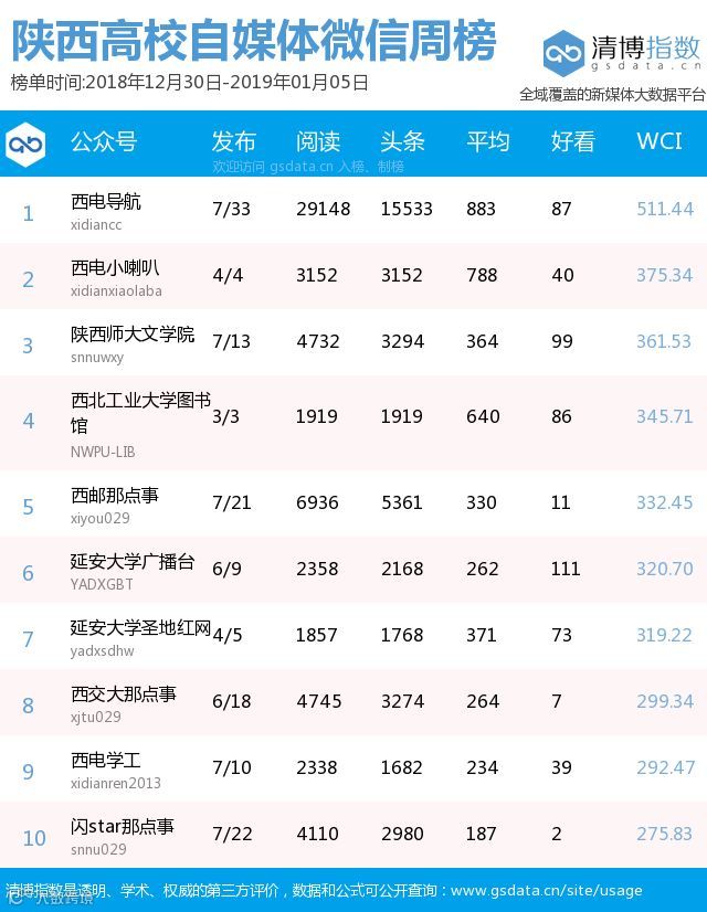 ● 本期陕西教育类新媒体周榜包含以下四个榜单:依次为陕西省教育部门官方微信周榜TOP25、陕西高校官方微信周榜TOP25、陕西高校自媒体周榜TOP10、陕西教育培训机构微信周榜TOP10。更多行业新媒体榜单可登陆清博指数官网查询:www.gsdata.cn.