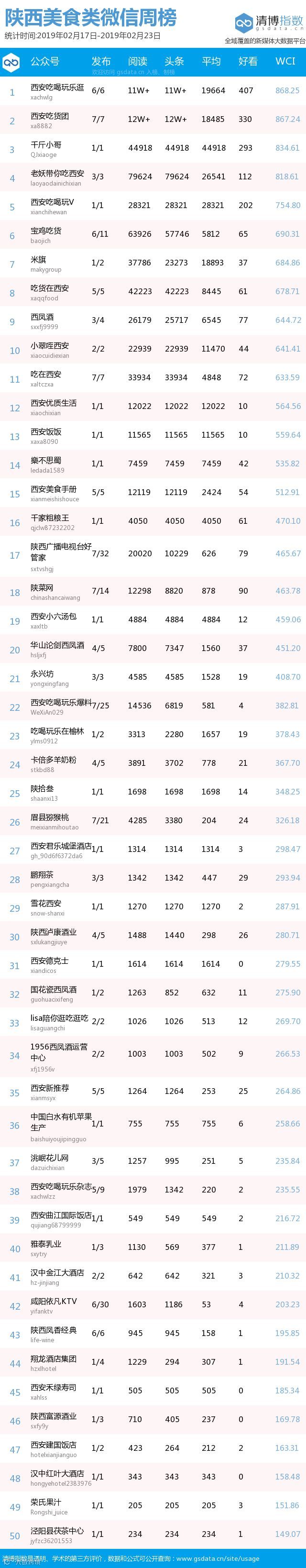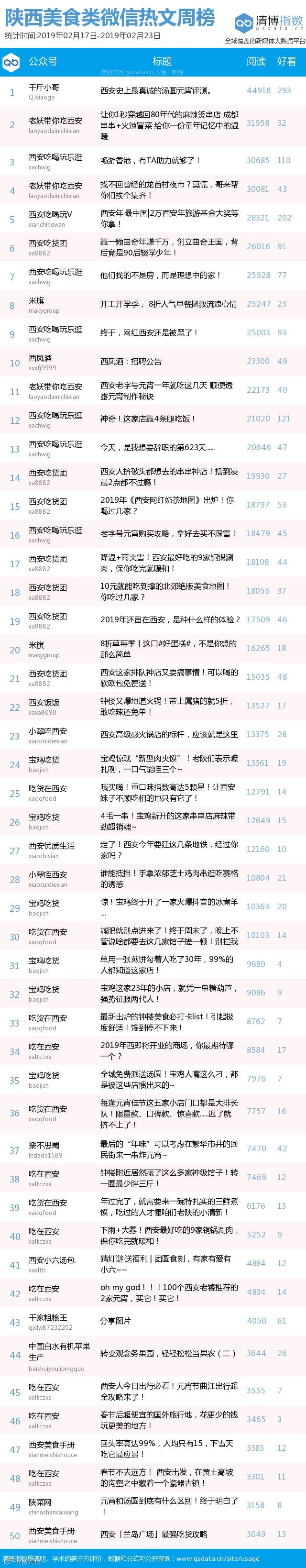 最新陕西美食类微信公众号50强重磅出炉!TOP50上周共计发文259篇,阅读总量达到75万+,好看总量达到2344。数据相比上周有所上升,期待下期各大平台继续加油哦!