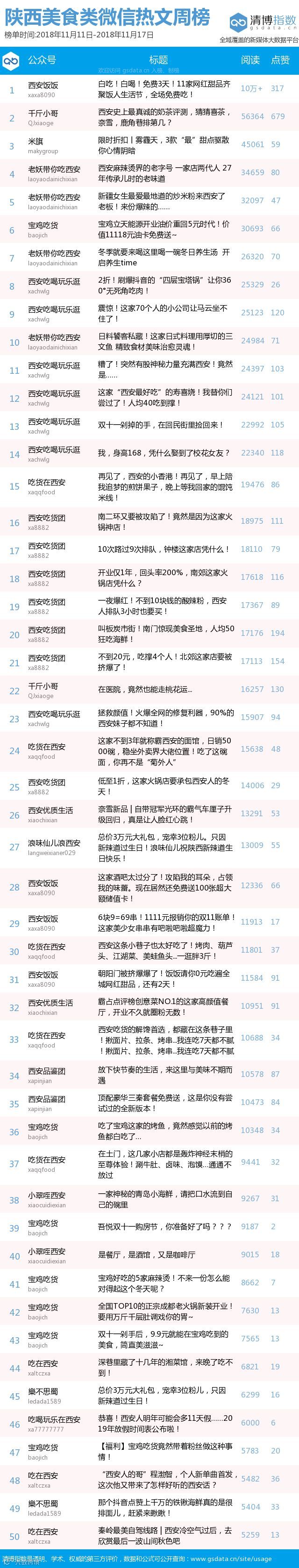 最新陕西美食类微信公众号50强重磅出炉!TOP50上周共计发文267篇,阅读总量达到96万+,点赞总量达到5055。数据相比上周有所下降,期待下期各大平台继续加油哦!