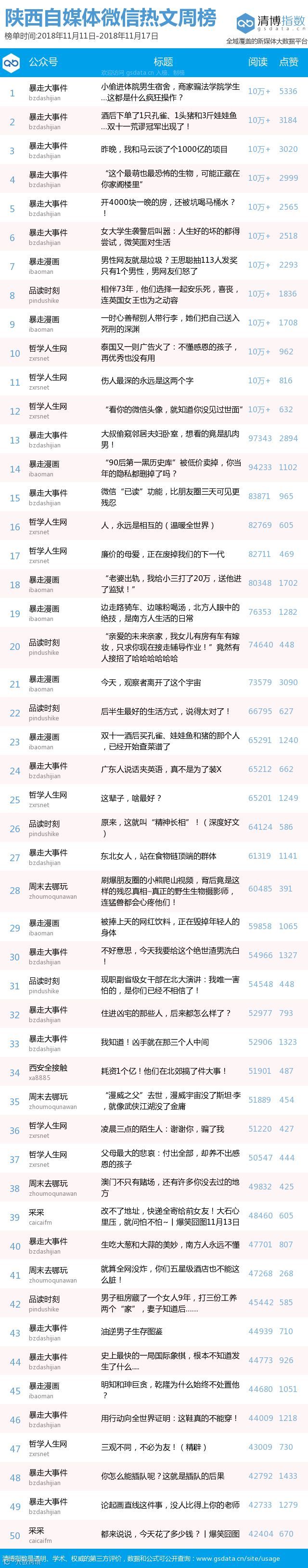 最新陕西自媒体微信公众号50强重磅出炉!TOP50上周共计发文1561篇,贡献阅读总量1221万+,点赞总量14万+,三项指标较上期均有所下降。(查看榜单可直接下滑)