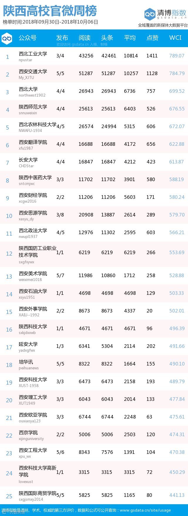 ● 本期陕西教育类新媒体周榜包含以下四个榜单:依次为陕西省教育部门官方微信周榜TOP25、陕西高校官方微信周榜TOP25、陕西高校自媒体周榜TOP10、陕西教育培训机构微信周榜TOP10。更多行业新媒体榜单可登陆清博指数官网查询:www.gsdata.cn