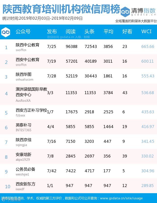 ● 本期陕西教育类新媒体周榜包含以下四个榜单:依次为陕西省教育部门官方微信周榜TOP25、陕西高校官方微信周榜TOP25、陕西高校自媒体周榜TOP10、陕西教育培训机构微信周榜TOP10。更多行业新媒体榜单可登陆清博指数官网查询:www.gsdata.cn.