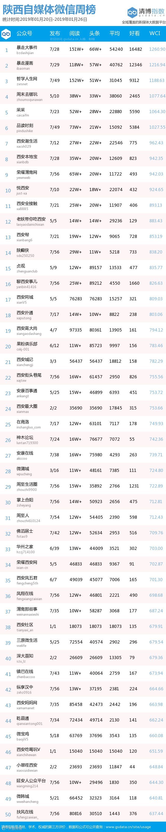 最新陕西自媒体微信公众号50强重磅出炉!TOP50上周共计发文1384篇,贡献阅读总量1178万+,好看总量6万+,三项指标较上期均有所上升。(查看榜单可直接下滑)