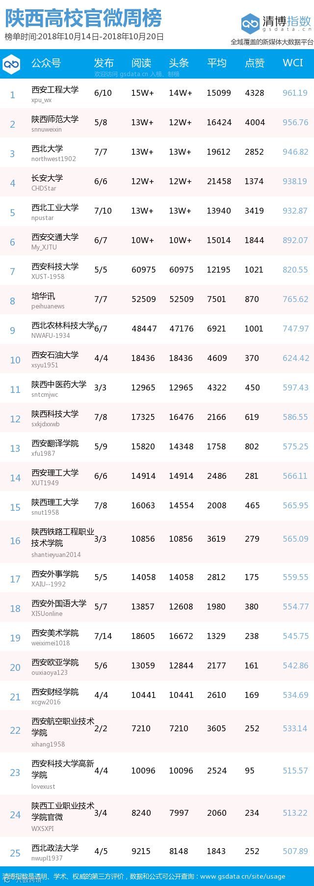 陕西高校官方微信周榜TOP25,共计推文159篇,阅读总数113万+,点赞总数25935,数据相比上周有所回升。