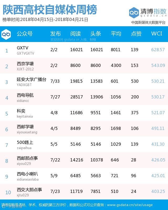 ● 本期陕西教育类新媒体周榜包含以下四个榜单:依次为陕西省教育部门官方微信周榜TOP25、陕西高校官方微信周榜TOP25、陕西高校自媒体周榜TOP10、陕西教育培训机构微信周榜TOP10。更多行业新媒体榜单可登陆清博指数官网查询:www.gsdata.cn