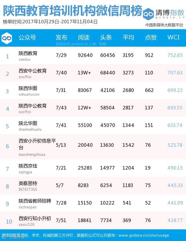 ● 本期陕西教育类新媒体周榜包含以下四个榜单:依次为陕西省教育部门官方微信周榜TOP25、陕西高校官方微信周榜TOP25、陕西高校自媒体周榜TOP10、陕西教育培训机构微信周榜TOP10。更多行业新媒体榜单可登陆清博指数官网查询:www.gsdata.cn