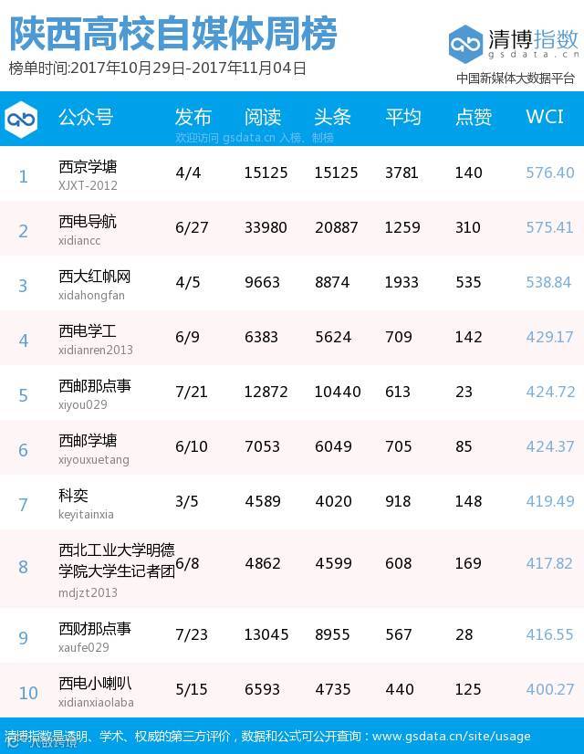 陕西高校自媒体微信周榜TOP10,共计推文158篇↑,阅读总数达到11万+↑,点赞总数为1725↑。各项指数都有所增长,阅读总数增加了3979。