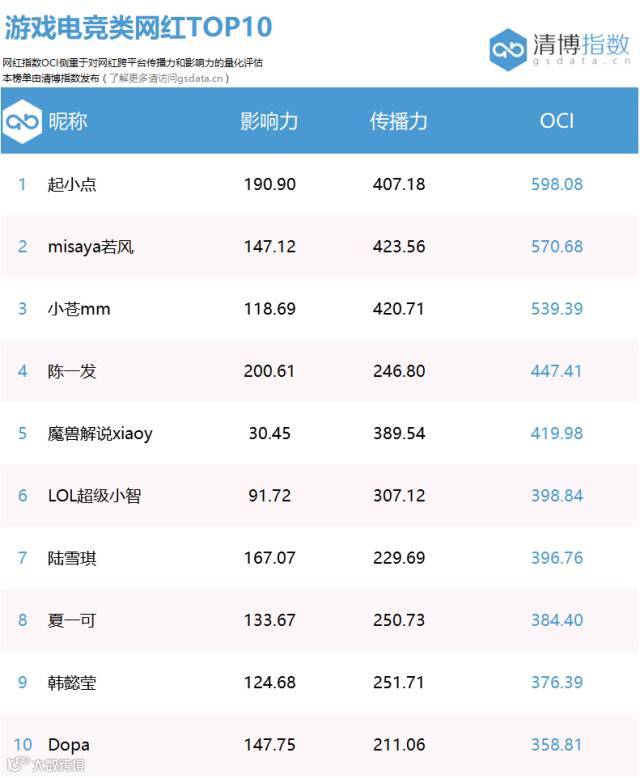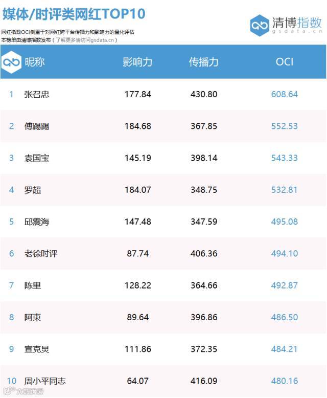 网红指数OCI(Online Celebrity Index):榜单公式以及数据说明,详情请登录网址www.gsdata.cn/site/usage#OCI