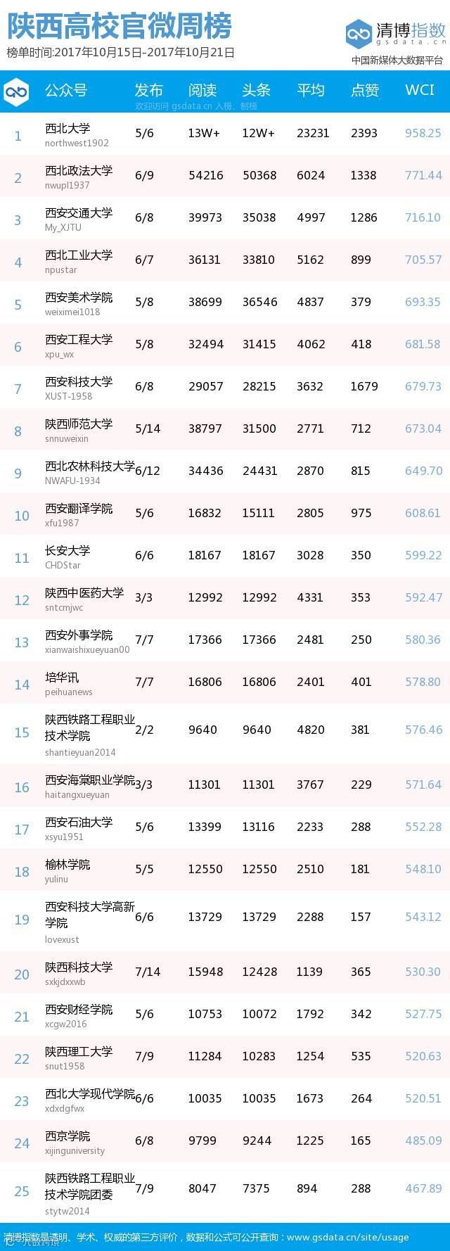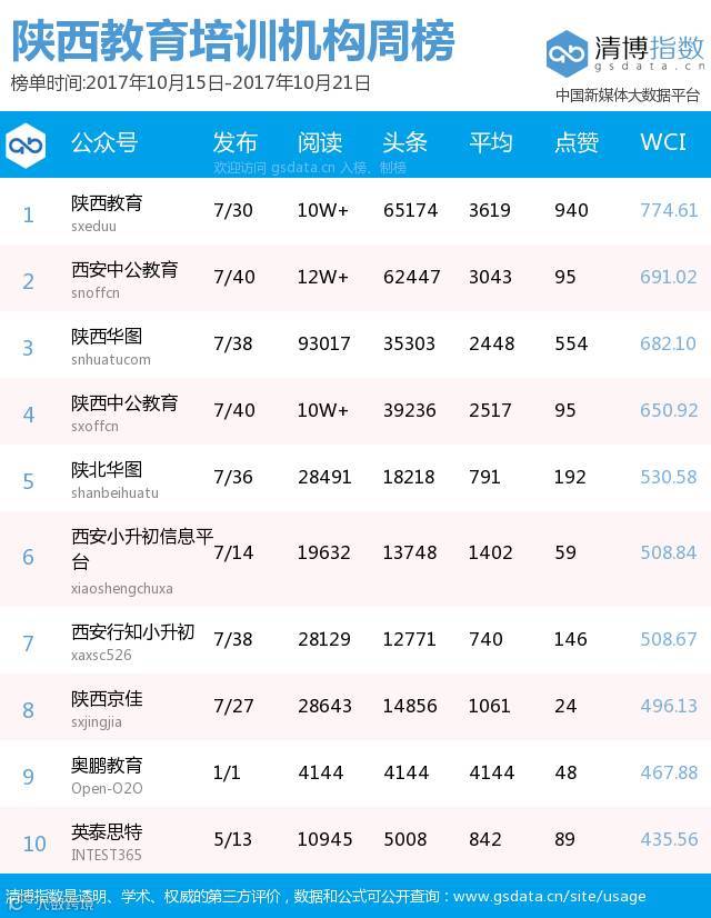 ● 本期陕西教育类新媒体周榜包含以下四个榜单:依次为陕西省教育部门官方微信周榜TOP25、陕西高校官方微信周榜TOP25、陕西高校自媒体周榜TOP10、陕西教育培训机构微信周榜TOP10。更多行业新媒体榜单可登陆清博指数官网查询:www.gsdata.cn