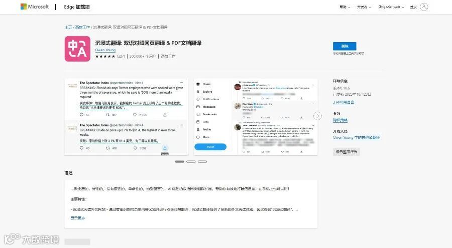 沉浸式阅读外文网站:通过智能识别网页主要内容区域,并进行双语对照翻译,带来全新的外文阅读体验,因此得名“沉浸式翻译”。