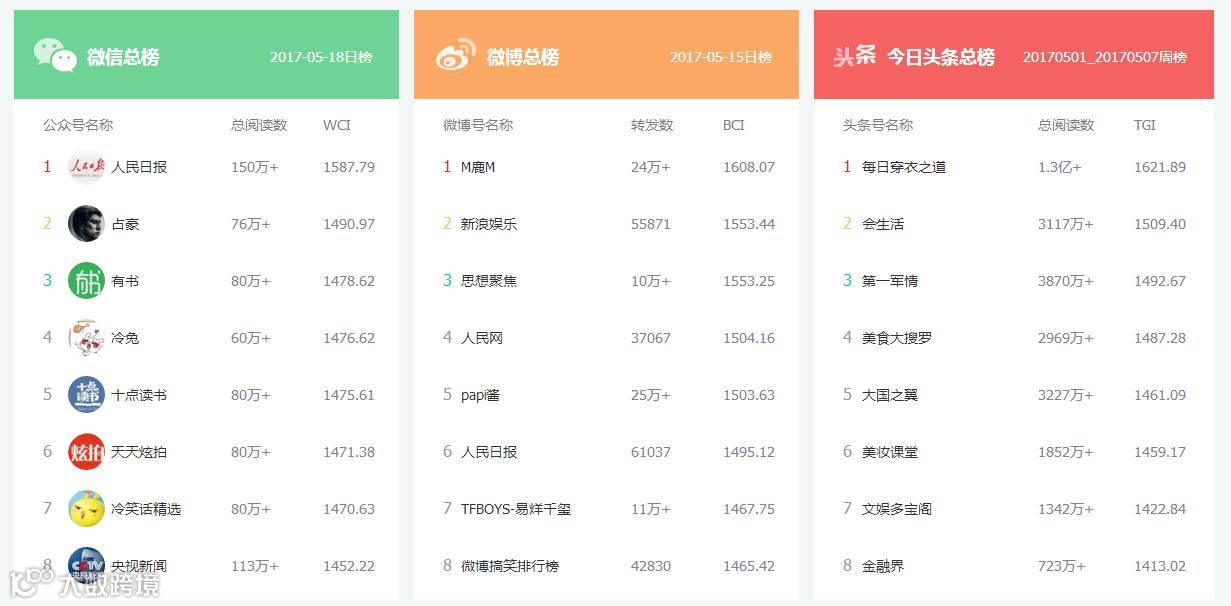 清博指数是国内领先的第三方新媒体数据搜索引擎,国内领先的“两微一端”新媒体大数据平台。清博目前已收录1900万+微信数据、2亿+微博数据、93万+APP数据,以及知乎、论坛、博客、平媒电子报、海外媒体等海量数据。清博日更新64万+个头部微信公号的数据,每天有超过2000个榜单发布,独有的WCI、BCI、ACI权威算法公式已成为各大部委、央企、500强企业的评价标准。