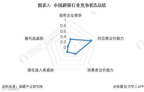 从五力竞争模型角度分析,超算行业上游基础硬件、基础软件是未来需要重点攻克的方向,国产芯片和超算软件生态发展仍然薄弱,国产替代能力亟需加强,上游议价能力较强;行业下游应用广泛,下游议价能力较弱。同时,超算行业现有竞争者较少,市场集中度高;行业技术壁垒、资金壁垒高企,潜在进入者威胁小;超级计算是计算科学的重要前沿分支,替代品威胁小。