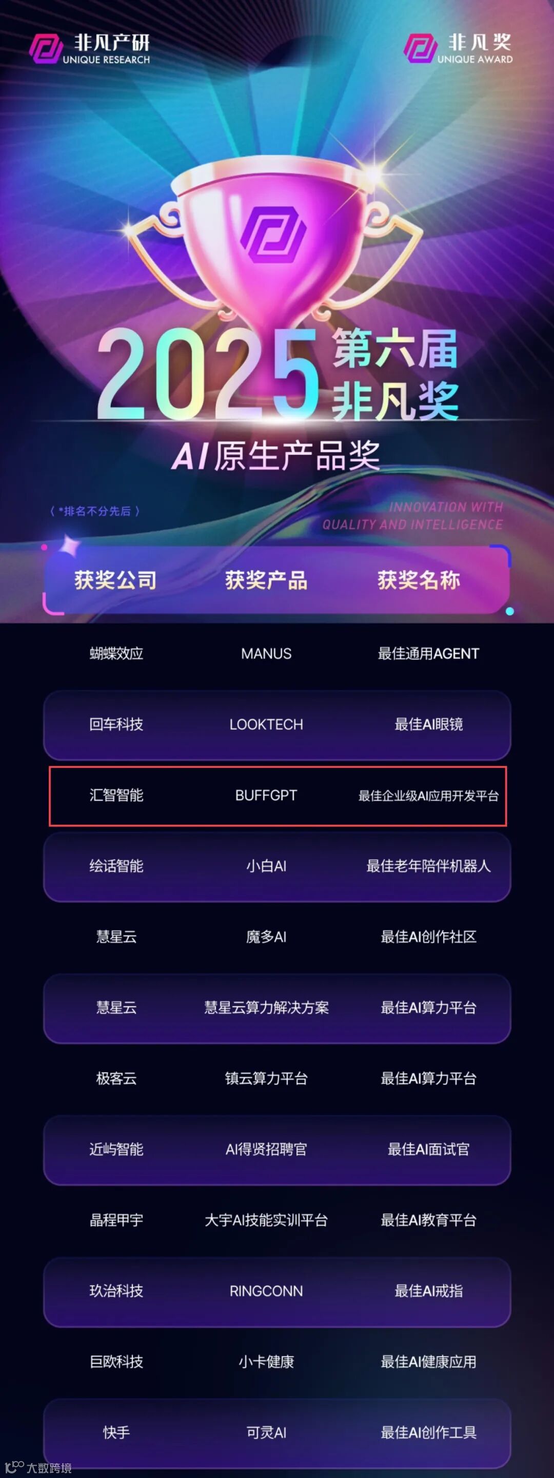 4月18日,非凡产研主办的「2025年度生成式AI商业高峰论坛暨第六届非凡颁奖典礼」在上海成功举办。会上,2025第六届非凡奖-AI原生产品奖正式揭晓。经过严格的筛选和评审,汇智智能凭借在企业级 AI 应用开发领域的创新突破与场景赋能实力,荣获最佳企业级AI应用开发平台奖。此次获奖,不仅是对汇智智能技术实力与应用落地性的双重认可,更彰显了其在企业级 AI 应用开发领域的领先地位。「非凡奖」是由非凡产研发起的全球AI商业创新标杆奖项,是中国首个聚焦AI商业落地实践的专业奖项,致力于挖掘全球生成式AI的原生产品、创新场景与标杆案例,覆盖国内、出海及全球化三大维度,推动营销、内容、销售、体验等领域的AI深度赋能与价值重构。最终,经过层层筛选,汇智智能自主研发的 BuffGPT 凭借在产品新质力、技术原生力、商业落地性、场景创新度等四大维度的出色表现荣获AI原生产品奖。BuffGPT 平台,是基于汇智智能先进AI能力和多年技术经验,向开发者、政企提供的一站式AI开发服务平台,能够帮助用户快速创建和部署 AI 原生应用,管理全生命周期AI解决方案。 从模型的选型评估到训练优化,从应用的搭建调试到上线运维,BuffGPT 平台均提供了全方位的支持,极大降低了 AI开发门槛与成本。即使是非专业出身的用户也能快速上手,大幅降低开发门槛,节省人力和时间成本。同时平台具备高度的灵活性和可扩展性,用户可根据自身业务特点对模型进行定制化调整与优化,以适应独特的企业业务流程和应用场景,为打造差异化竞争优势的 AI 应用提供有力保障。并且得益于平台的技术架构,模型运行具有高效稳定性,无论是高并发的用户请求还是大规模的数据处理任务,都能从容应对,保障应用的流畅运行和快速响应,助力开发者和政企在数字化转型浪潮中抢占先机,推动业务的创新发展和智能化升级。目前,BuffGPT 的服务已覆盖全国多个省市地区,累计超过1000+家企业和组织用户,覆盖零售、金融、法律、教育、政务等多个行业领域。未来,汇智智能将继续携手更多企业组织,探索低代码与AI结合的更多可能性,推动AI技术在更多场景中落地应用。