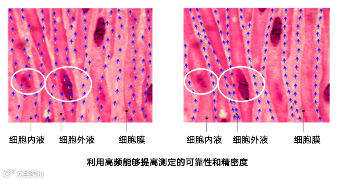 由于细胞膜电容的存在,低频电流只能通过机体细胞外液,而高频电流可以通过机体细胞内液。高低频段同时测量,可以准确得出身体水分并对分析减重方式的正确性有重要的指导意义。