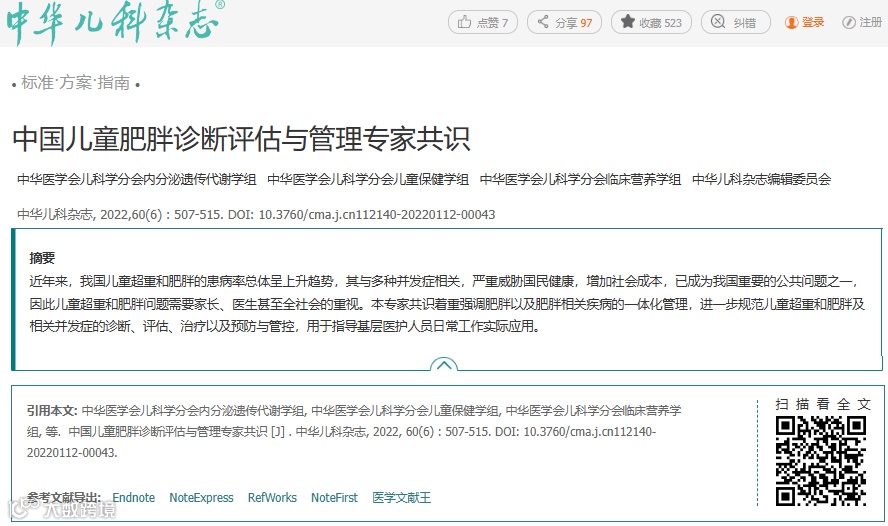 来源:中华医学会儿科学分会内分泌遗传代谢学组 中华医学会儿科学分会儿童保健学组 中华医学会儿科学分会临床营养学组 中华儿科杂志编辑委员会,《中国儿童肥胖诊断评估与管理专家共识(2022)》,中华儿科杂志, 2022,60(6) : 507-515