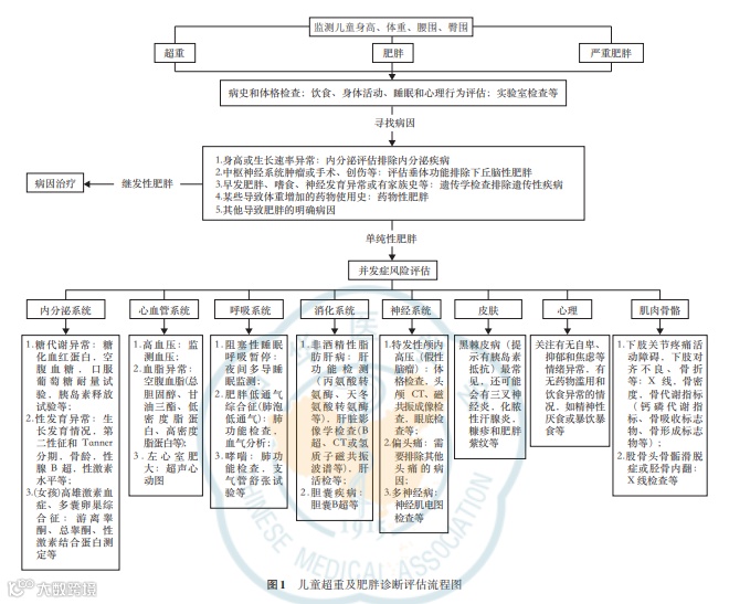 超重或肥胖的儿童的全面评估流程见图。病史应询问饮食、身体活动和睡眠的情况,是否有肥胖相关综合征的症状等,用药史,发育史,肥胖家族史等。体格检查应包括身高、体重、腰围、臀围、体型及性发育分期等。还需注意有无智力发育异常或畸形体征,是否合并黑棘皮病或皮肤紫纹,青春期女孩是否有痤疮和多毛,还包括特发性颅内高压(假性脑瘤)的眼底检查,双下肢或膝关节的压痛和活动范围,甲状腺检查和外周水肿等。建议对肥胖的儿童进行潜在的并发症评估,包括糖尿病及糖尿病前期、血脂异常、高血压、非酒精性脂肪肝病、多囊卵巢综合征和阻塞性睡眠呼吸暂停等。