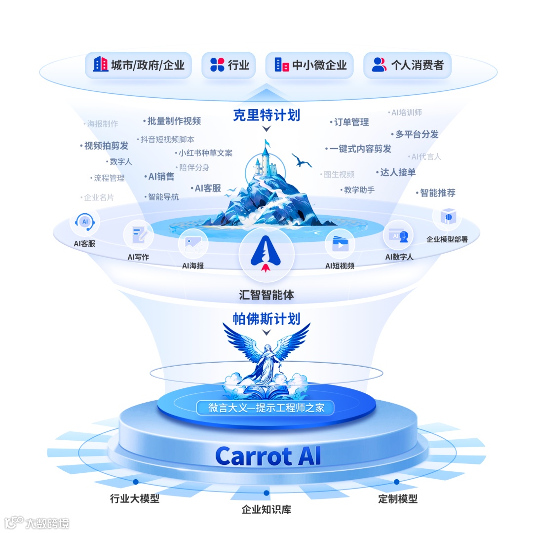 汇智智能体以公司自研的数字营销领域行业大模型Carrot AI为核心,结合不同应用场景,实现高质量多模态交付,为企业打造AGI时代超级个体和自有模型。AI智能体系列解决方案包括企业专属客服机器人、文/图/音视频/数字人AIGC内容创作和分发服务等。目前已广泛应用在政务、农业、文旅、餐饮、教培、休娱、互联网等多个行业。