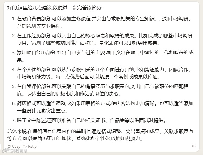 如果想要继续修改自己的简历,可以让Claude 2根据上传的简历提出修改建议,然后让Claude 2自行提问,并进行简历重写: