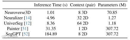 此外,尽管Neuroverse3D处理的3D上下文信息量更大(8对3D图像),但其推理速度却快于需要逐片处理2D上下文的对比模型,因为它避免了为每个切片重复计算上下文特征。