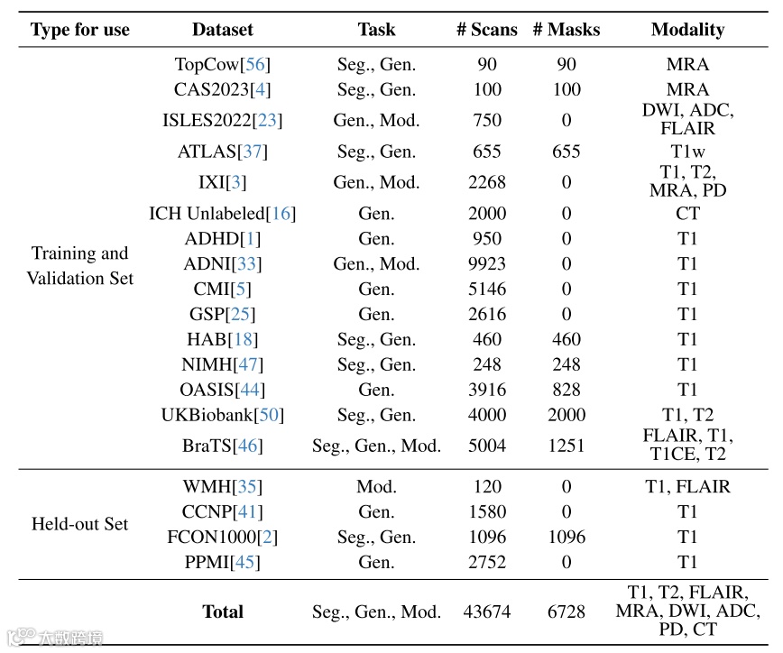 研究团队收集了来自19个数据集、共计43,674个3D多模态扫描,用于模型训练和评估。评估在4个留出数据集上进行,涵盖了14项不同的任务,包括解剖结构分割、肿瘤分割、血管分割以及偏置场校正、去噪、修复、超分辨率等多种生成任务。